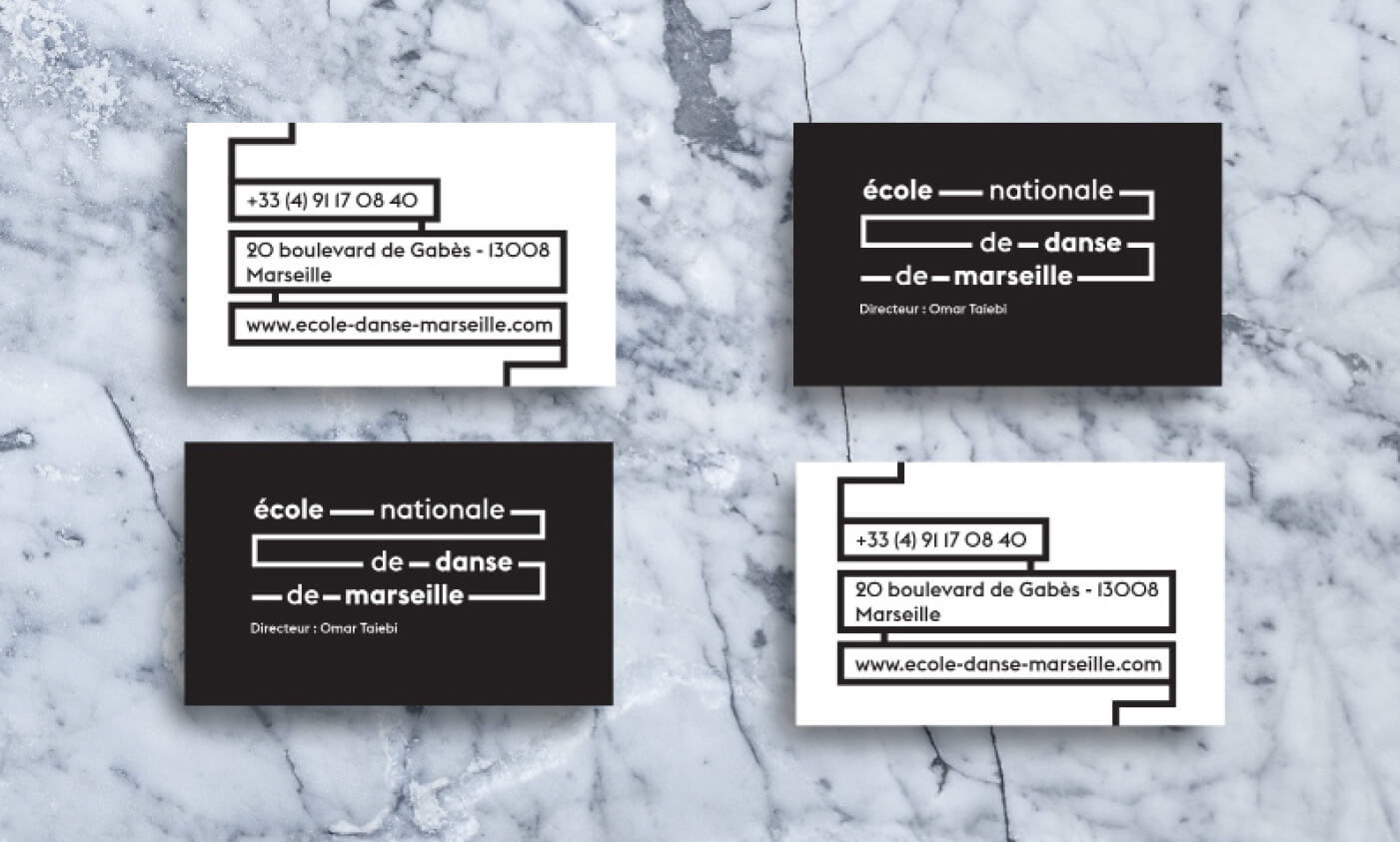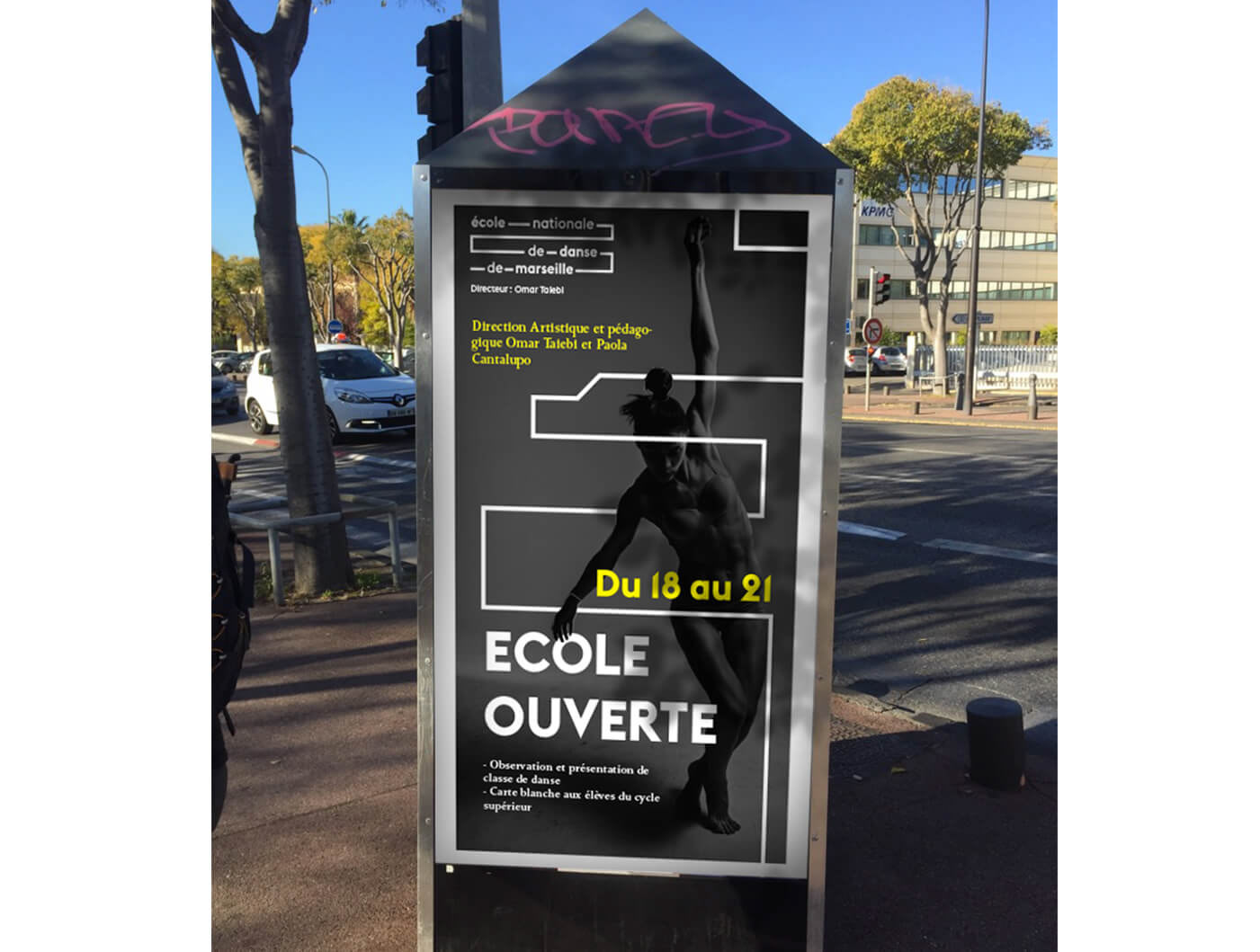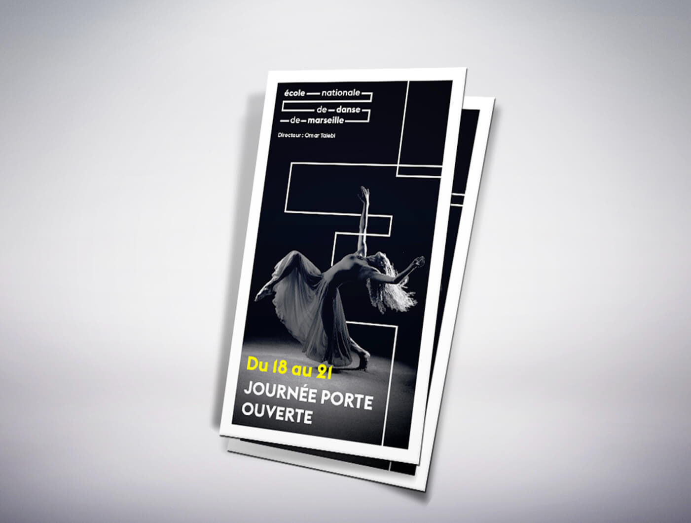 Création de l'identité visuelle pour l'école Nationale de Danse de Marseille ainsi que touts les supports de communications print et web et également la signalétique du lieu.